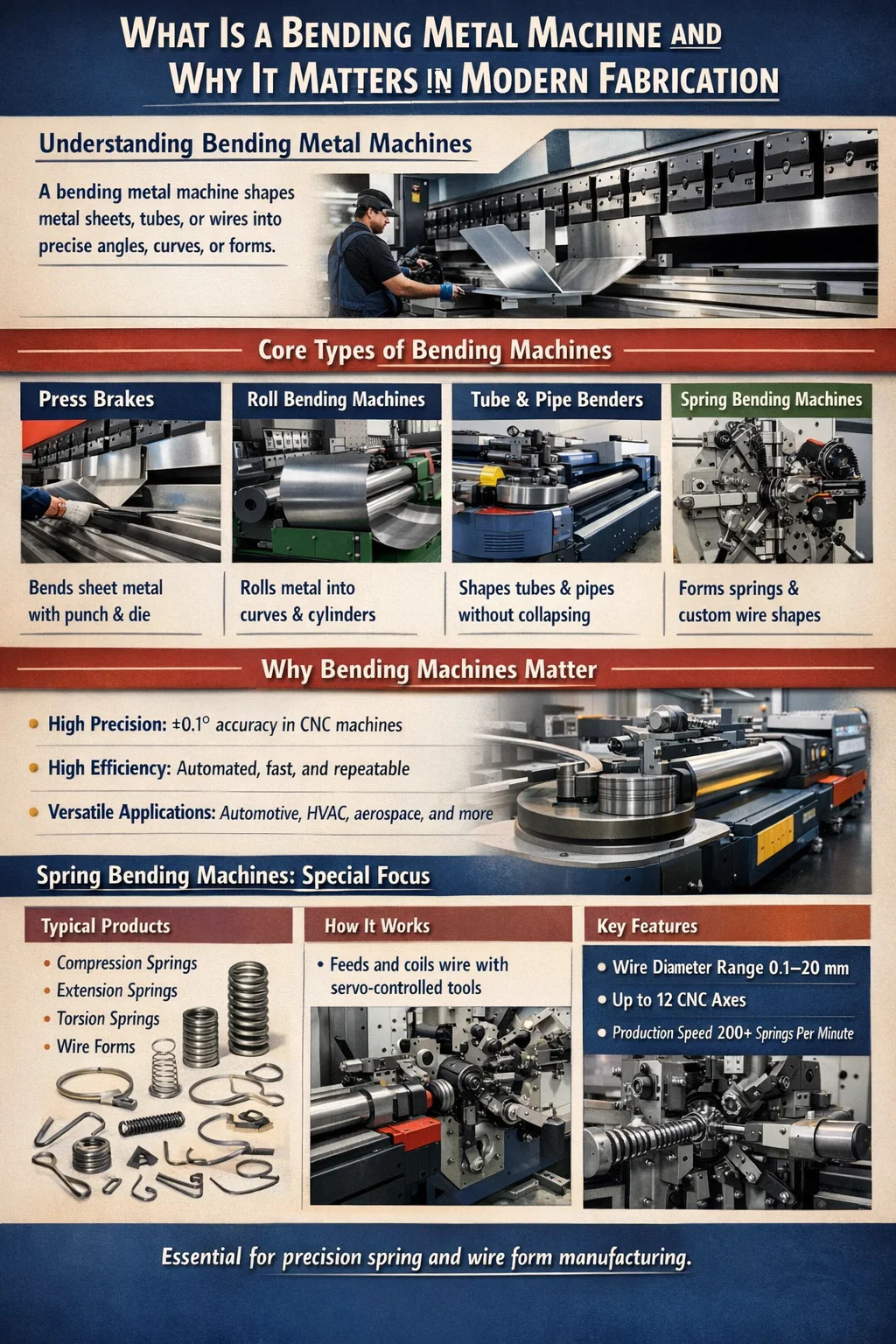 Ohýbačka pružín je špecializovanou podskupinou širšej rodiny ohýbačiek. Kým všeobecný ohraňovací lis sa zameriava na plech, a stroj na ohýbanie pružín je špeciálne navrhnutý na navíjanie, navíjanie a tvarovanie drôtu alebo tyče do tlačných pružín, ťažných pružín, torzných pružín a vlastných tvarov drôtu. Tieto dva typy strojov často koexistujú v rovnakom zariadení – a pochopenie toho, ako sa navzájom dopĺňajú, je nevyhnutné pre každého manažéra výroby, ktorý získava vybavenie.