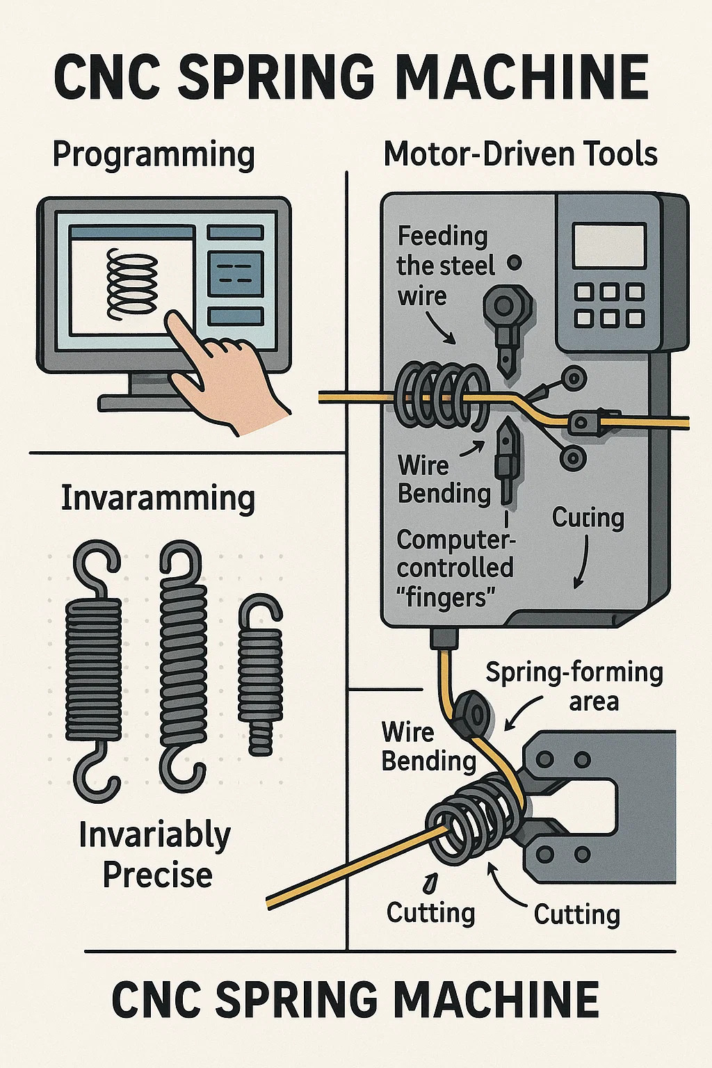Výraz „CNC pružina“ sa vzťahuje na výrobu pružín pomocou počítačom riadeného pružinového stroja. Používa počítačové programovanie na vydávanie pokynov, nasmerovanie viacerých nezávislých motorov na pohon ohýbacích nástrojov a rezačiek, presné, rýchle a flexibilné ohýbanie a rezanie zvitku oceľového drôtu na získanie vami navrhnutej pružiny. Táto metóda je jadrom modernej výroby pružín, pretože je rýchla, presná a schopná vytvárať zložité tvary.