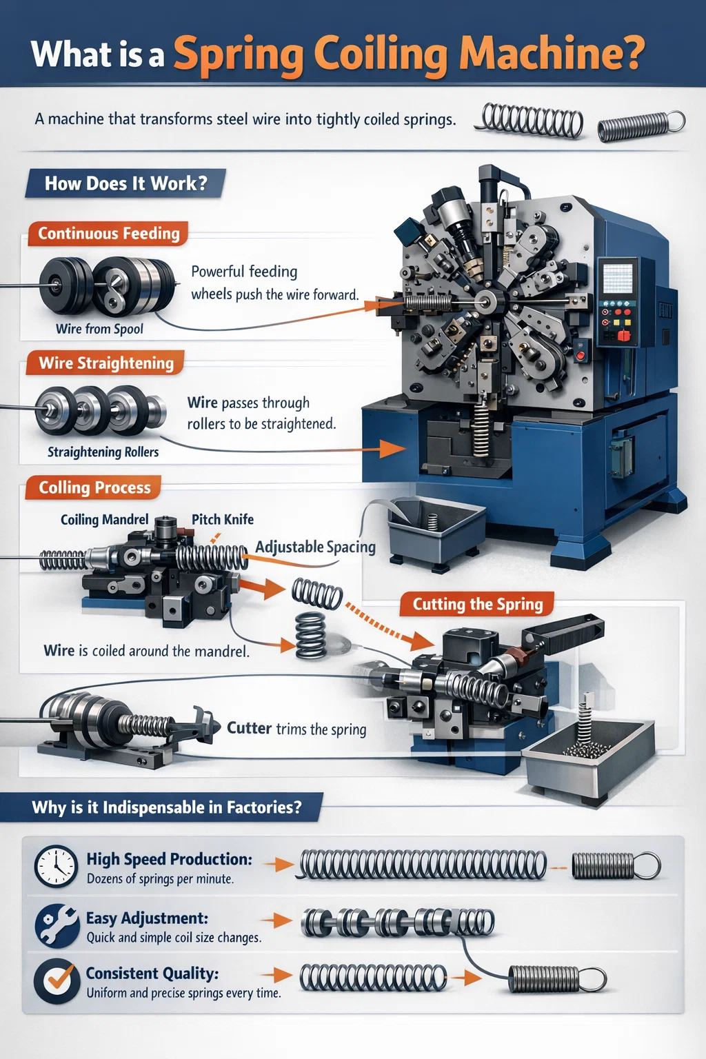 Jednoducho povedané, stroj na navíjanie pružín je stroj špeciálne navrhnutý na "navíjanie" kovového drôtu do špirálového tvaru.