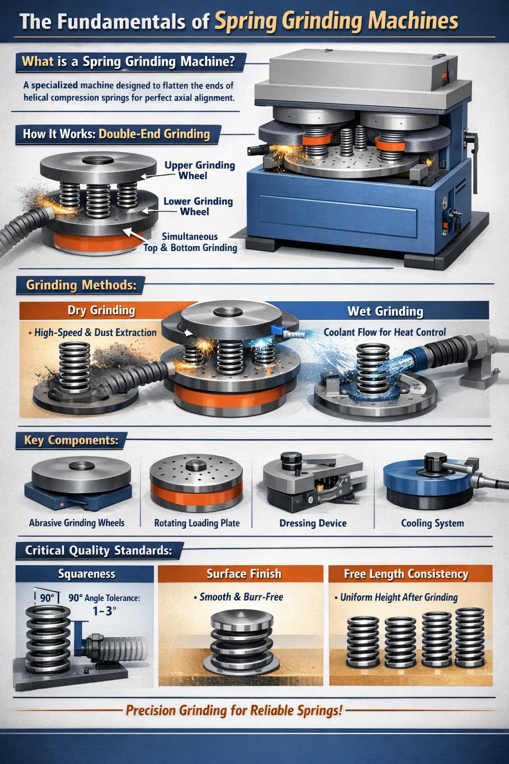 Suché brúsenie je najbežnejšou metódou pre štandardné pružiny z uhlíkovej ocele. Spolieha sa na vysokú hlasitosť systém odsávania prachu na odstránenie kovových triesok a abrazívnych častíc. Aj keď je brúsenie za sucha účinné pre vysokorýchlostnú výrobu, môže viesť k nadmernému hromadeniu tepla, ak je rýchlosť posuvu príliš agresívna, čo môže potenciálne zmeniť temperovanie pružiny.