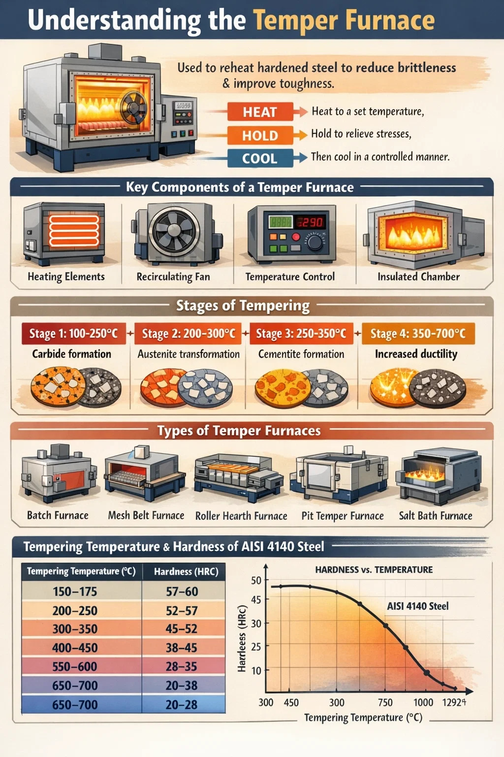 A temperovacia pec je typ priemyselnej pece na tepelné spracovanie špeciálne navrhnutý na vykonávanie procesu popúšťania kovov – najčastejšie kalenej ocele. Jeho hlavnou funkciou je ohrievať predtým ochladený alebo kalený kovový komponent na teplotu pod jeho dolným kritickým bodom, udržiavať ho na tejto teplote počas kontrolovaného obdobia a potom ho nechať regulovaným spôsobom vychladnúť. Tento proces uvoľňuje vnútorné napätie, znižuje krehkosť a zlepšuje húževnatosť bez výrazného obetovania tvrdosti.