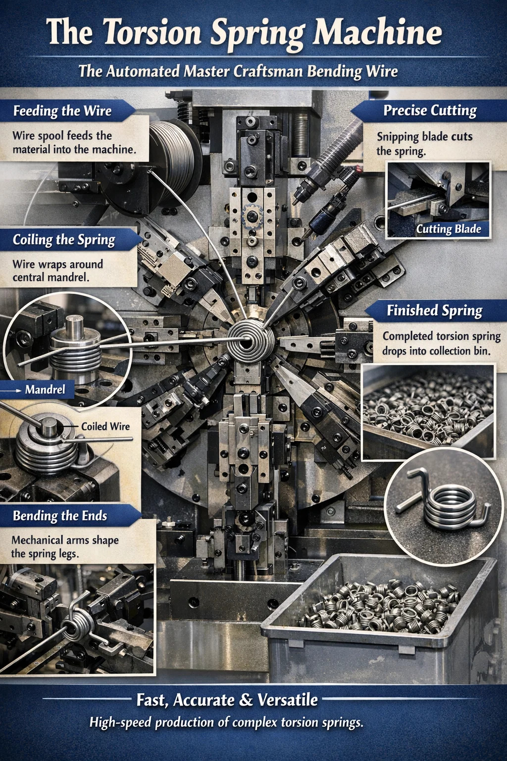 Ak ste niekedy videli drevený štipček na prádlo alebo čap automatických dverí, pružina vo vnútri so stočeným stredom a dvoma „nohami“ vybiehajúcimi z každého konca je jeho výtvor. Bežné pružinové stroje môžu navíjať iba jednoduché kruhy, ale stroj na torzné pružiny môže nielen navíjať drôt, ale aj ohýbať konce pružiny do rôznych zložitých uhlov, čo jej umožňuje zavesiť alebo podoprieť iné časti.