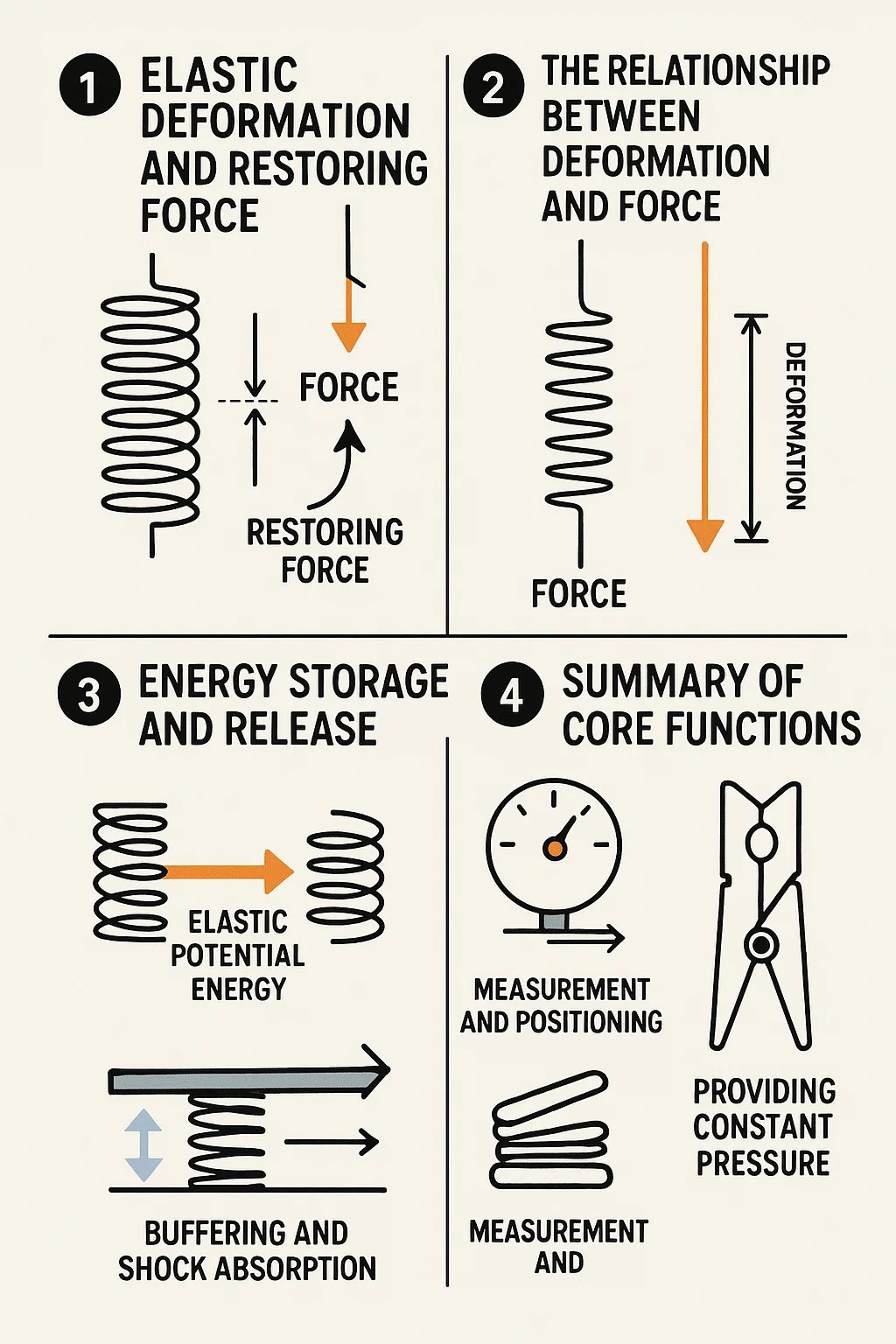 Tlmenie a tlmenie nárazov: Pružiny môžu absorbovať energiu z nárazov a vibrácií a postupne ju uvoľňovať v priebehu času, čím chránia štruktúru (napríklad systém tlmenia nárazov v aute). Meranie a polohovanie: Vo váhe možno na meranie hmotnosti použiť deformáciu pružiny; v mnohých mechanických zariadeniach sa používa na vrátenie dielov do ich počiatočnej polohy po dokončení práce (ako sú tlačidlá a spínače).